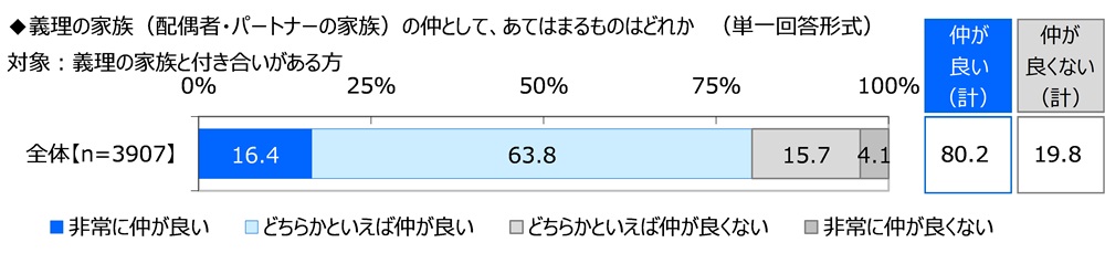 義理の家族との付き合いがある方(3,907名)に、義理の家族との仲として、あてはまるものを聞いたところ、「非常に仲が良い」は16.4%、「どちらかといえば仲が良い」は63.8%で合計した『仲が良い(計)』は80.2%となりました。義理の家族とは良好な関係を築けている人が多いようです。
