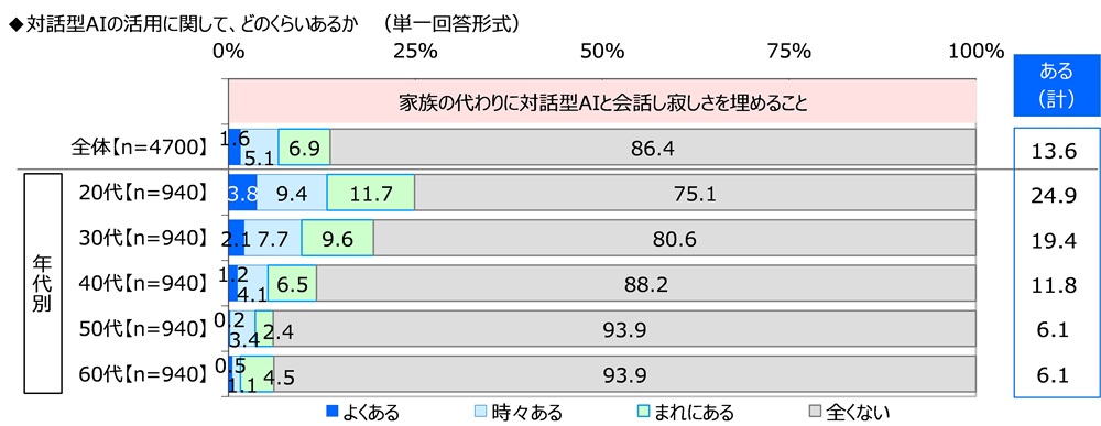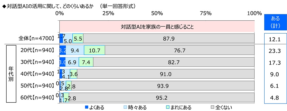 全回答者(4,700名)に、自分にとって“家族”とはどのような存在か聞いたところ、「心の支えになる存在」(48.7%)が最も高くなり、「安心できる存在」(48.0%)、「助け合える存在」(46.8%)、「一緒にいて落ち着く存在」(40.1%)、「守りたいと思う存在」(39.7%)が続きました。