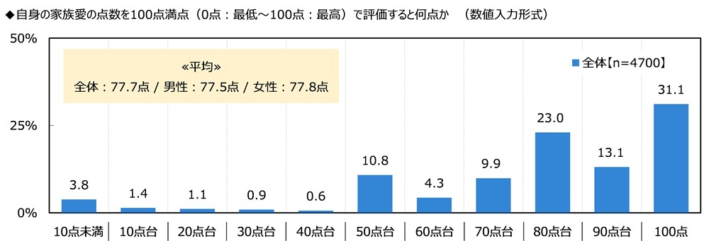自身の家族愛の点数を100点満点(0点:最低~100点:最高)で評価すると何点か聞くと、「100点」に最も多くの回答が集まり、平均は77.7点でした。