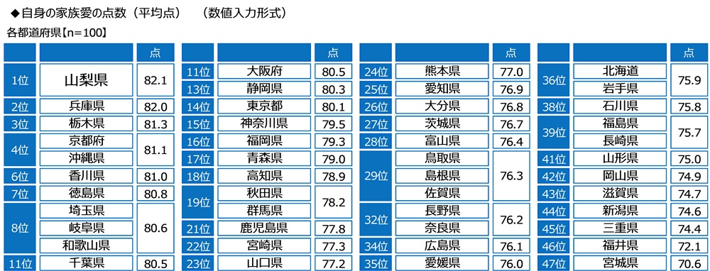 都道府県別にみると、平均は1位が「山梨県」(82.1点)2位が「兵庫県」(82.0点)3位が「栃木県」(81.3点)4位が「京都府」と「沖縄県」(いずれも81.1点)でした。最下位は「宮城県」(70.6点)でした。