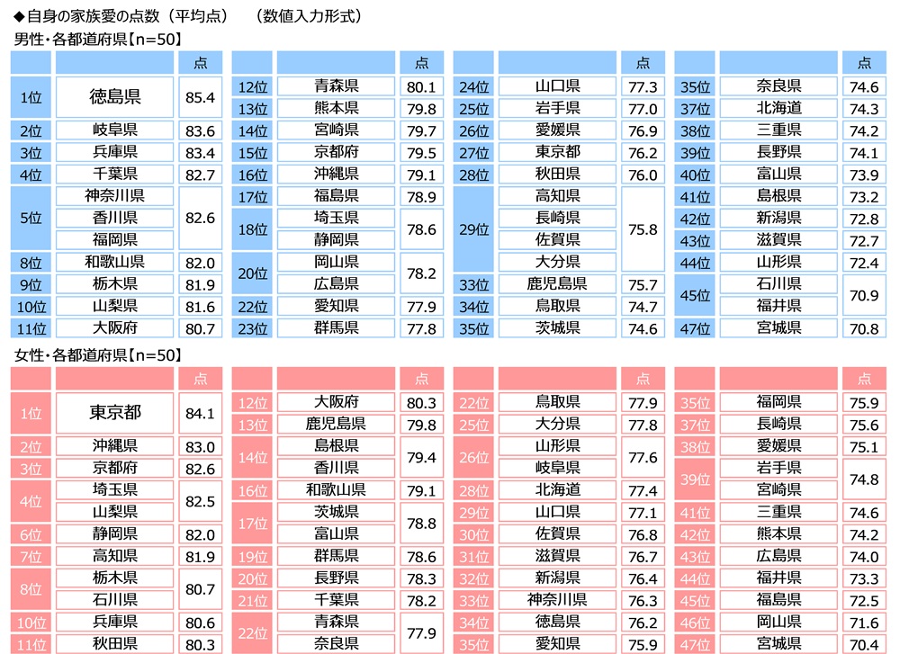 男女・都道府県別にみると、平均は男性では1位が徳島県(85.4点)、2位が岐阜県(83.6点)、3位が兵庫県(83.4点)、女性では1位が東京都(84.1点)、2位が沖縄県(83.0点)、3位が京都府(82.6点)でした。