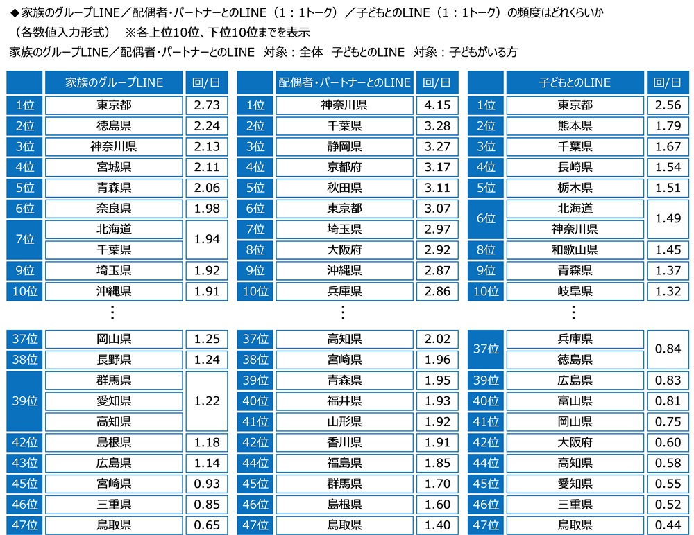 家族のグループLINEの頻度を聞いたところ、平均が最も多くなったのは、東京都(2.73回)となり、徳島県(2.24回)、神奈川県(2.13回)、宮城県(2.11回)、青森県(2.06回)が続きました。上位5位については、1日に2回以上でした。