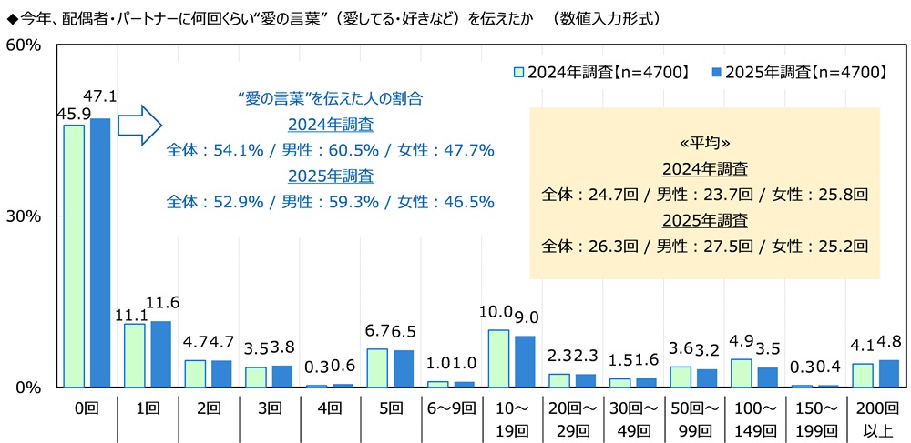 前回の調査結果と比較すると、“愛の言葉”を伝えた回数の平均は2024年24.7回→2025年26.3回と1.6回多くなりました。一方で、“愛の言葉”を伝えた人の割合は2024年54.1%→2025年52.9%と下降しました。