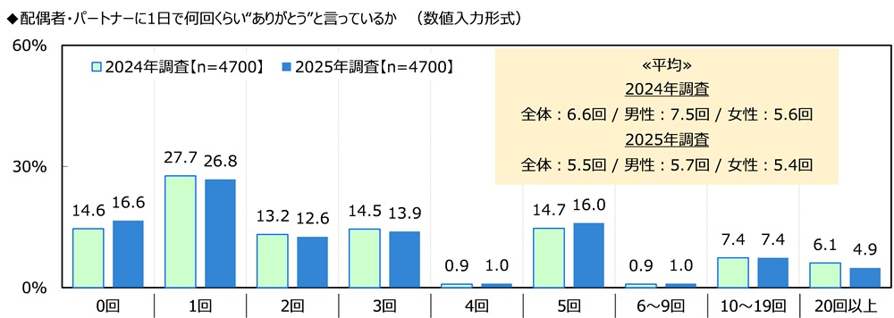 配偶者・パートナーに“ありがとう”と言っている回数 平均は5.5回/日