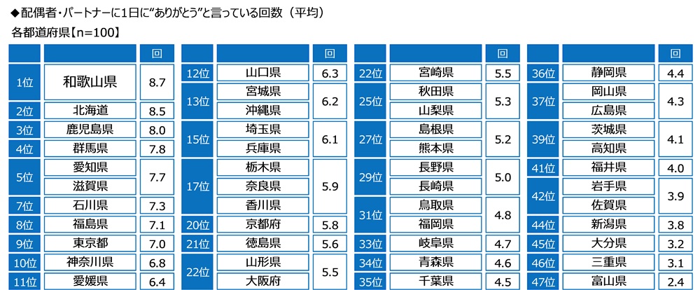 都道府県別にみると、1日に“ありがとう”と言っている回数の平均は、和歌山県(8.7回)が最も多くなり、北海道(8.5回)、鹿児島県(8.0回)、群馬県(7.8回)、愛知県と滋賀県(いずれも7.7回)が続きました。
