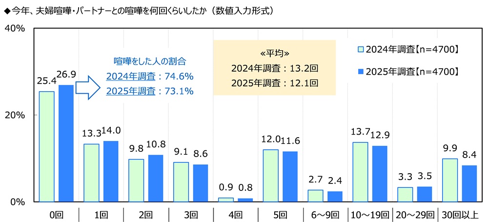前回の調査結果と比較すると、喧嘩をした人の割合(2024年74.6%→2025年73.1%)は1.5ポイント下降しました。また、今年、夫婦喧嘩・パートナーとの喧嘩をした回数の平均(2024年13.2回→2025年12.1回)においては1.1回少なくなり、今年、喧嘩をした人の割合と喧嘩をした平均回数のどちらも昨年調査を下回る結果となりました。