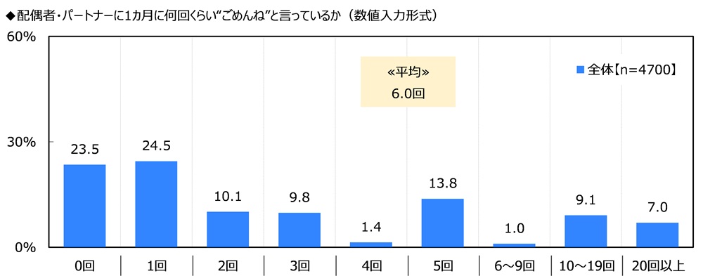 また、配偶者・パートナーに1カ月に何回くらい“ごめんね”と言っているか聞いたところ、「0回」(23.5%)や「1回」(24.5%)、「2回」(10.1%)、「5回」(13.8%)などに回答が分かれ、平均は6.0回でした。