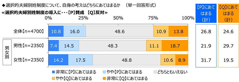全回答者(4,700名)に、選択的夫婦別姓制度について、自身の考えはどちらにあてはまるか聞いたところ、≪選択的夫婦別姓制度の導入に、賛成か、反対か≫では、『賛成』(【P】にあてはまる(計):「非常に」と「やや」の合計、以下同様)が26.8%、『反対』(【Q】にあてはまる(計):「非常に」と「やや」の合計、以下同様)が24.6%、「どちらともいえない」が48.6%となりました。
