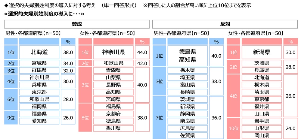 男女・都道府県別にみると、『賛成』と回答した人の割合が最も高くなったのは、男性では北海道(38.0%)、女性では神奈川県(44.0%)、『反対』と回答した人の割合が最も高くなったのは、男性では徳島県と高知県(いずれも40.0%)、女性では新潟県(30.0%)でした。
