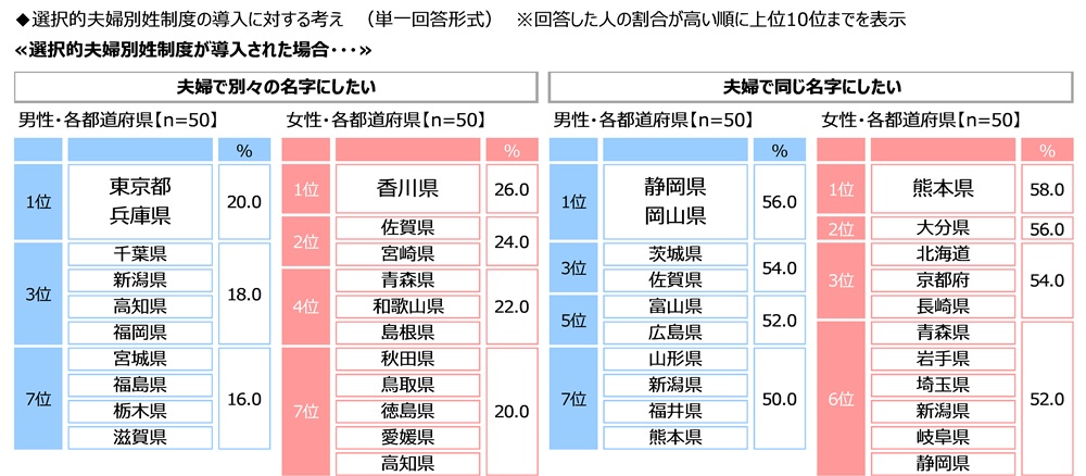 男女・都道府県別にみると、『夫婦で別々の名字にしたい』と回答した人の割合が最も高くなったのは、男性では東京都と兵庫県(いずれも20.0%)、女性では香川県(26.0%)、『夫婦で同じ名字にしたい』と回答した人の割合が最も高くなったのは、男性では静岡県と岡山県(いずれも56.0%)、女性では熊本県(58.0%)でした。