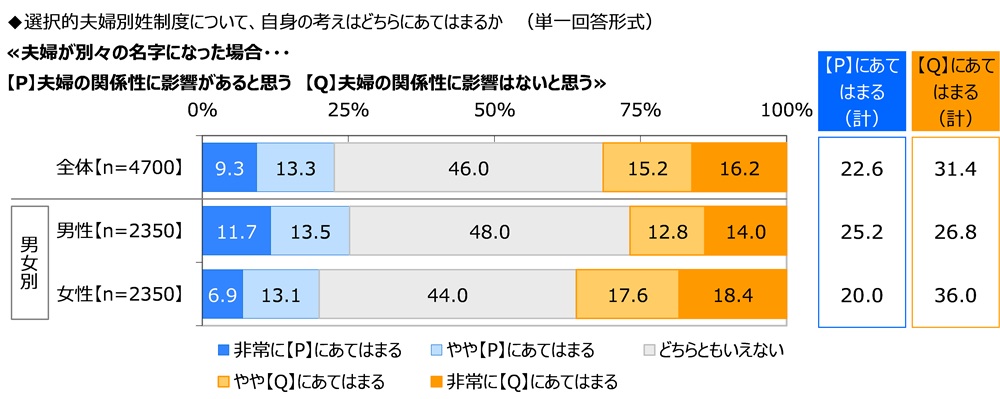 ≪夫婦が別々の名字になった場合、夫婦の関係性に影響があると思うか、夫婦の関係性に影響はないと思うか≫では、『夫婦の関係性に影響があると思う』が22.6%、『夫婦の関係性に影響はないと思う』が31.4%、「どちらともいえない」が46.0%となりました。