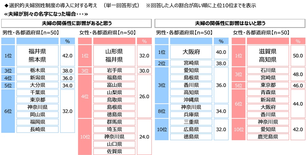 男女・都道府県別にみると、『夫婦の関係性に影響があると思う』と回答した人の割合が最も高くなったのは、男性では福井県と熊本県(いずれも42.0%)、女性では山形県と福井県(いずれも32.0%)、『夫婦の関係性に影響はないと思う』と回答した人の割合が最も高くなったのは、男性では大阪府(40.0%)、女性では滋賀県と高知県(いずれも50.0%)でした。
