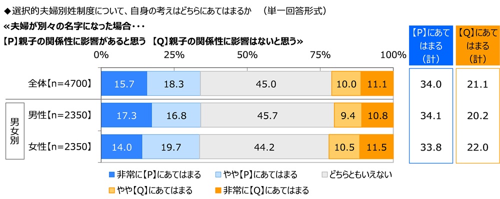 ≪夫婦が別々の名字になった場合、親子の関係性に影響があると思うか、親子の関係性に影響はないと思うか≫では、『親子の関係性に影響があると思う』が34.0%、『親子の関係性に影響はないと思う』が21.1%、「どちらともいえない」が45.0%となりました。
