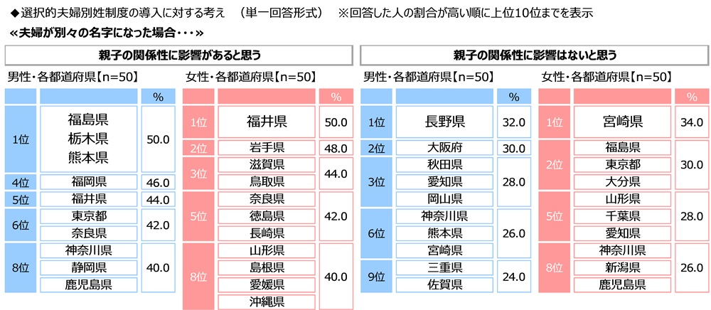 男女・都道府県別にみると、『親子の関係性に影響があると思う』と回答した人の割合が最も高くなったのは、男性では福島県・栃木県・熊本県(いずれも50.0%)、女性では福井県(50.0%)、『親子の関係性に影響はないと思う』と回答した人の割合が最も高くなったのは、男性では長野県(32.0%)、女性では宮崎県(34.0%)でした。