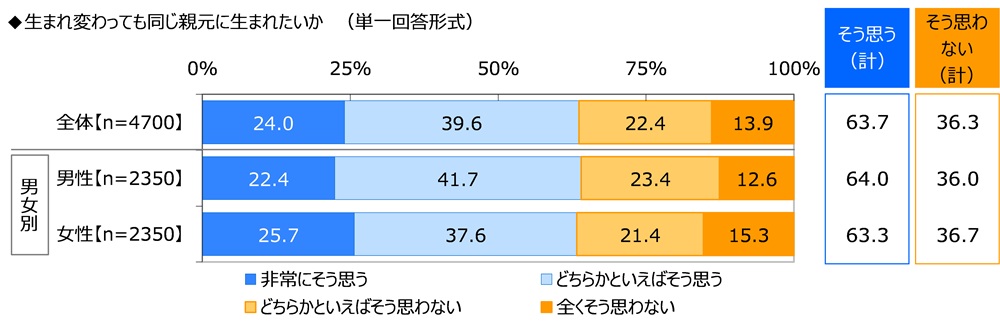 全回答者(4,700名)に、生まれ変わっても同じ親元に生まれたいか聞いたところ、「非常にそう思う」が24.0%、「どちらかといえばそう思う」が39.6%で、合計した『そう思う(計)』は63.7%となりました。