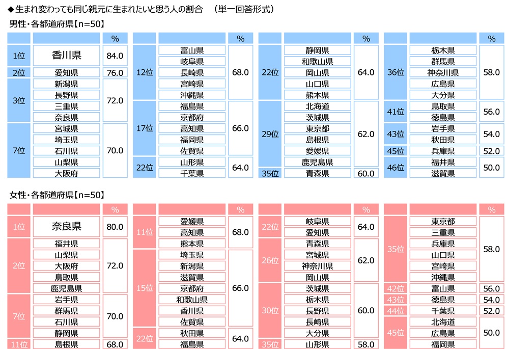 男女・都道府県別にみると、生まれ変わっても同じ親元に生まれたい人の割合は、男性では1位が香川県(84.0%)、2位が愛知県(76.0%)、3位が新潟県・長野県・三重県・奈良県(いずれも72.0%)、女性では1位が奈良県(80.0%)、2位が福井県・山梨県・大阪府・鳥取県・鹿児島県(いずれも72.0%)でした。