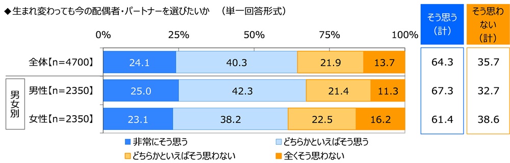 生まれ変わっても今の配偶者・パートナーを選びたいか聞いたところ、「非常にそう思う」が24.1%、「どちらかといえばそう思う」が40.3%で、合計した『そう思う(計)』は64.3%となりました。