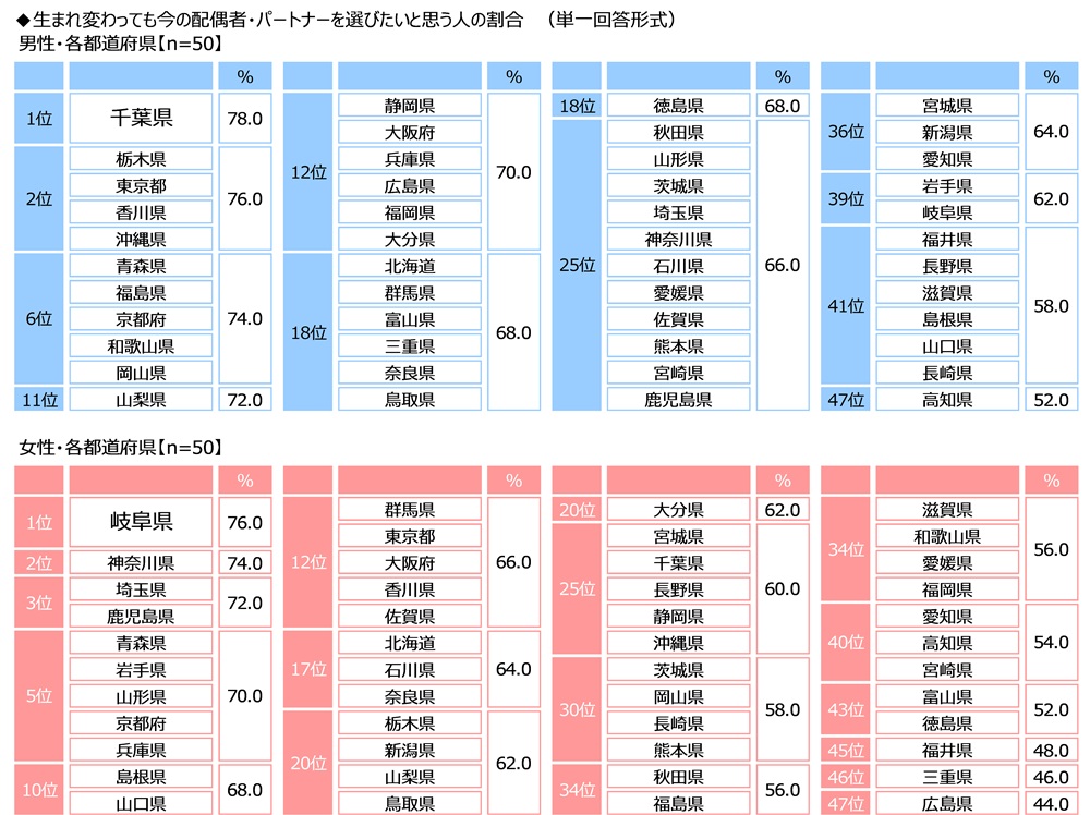 男女・都道府県別にみると、生まれ変わっても今の配偶者・パートナーを選びたい人の割合は、男性では1位が千葉県(78.0%)、2位が栃木県・東京都・香川県・沖縄県(いずれも76.0%)、女性では1位が岐阜県(76.0%)、2位が神奈川県(74.0%)、3位が埼玉県・鹿児島県(いずれも72.0%)でした。