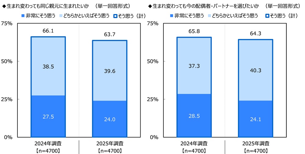 また、【生まれ変わっても今の配偶者・パートナーを選びたいか】では『そう思う(計)』の割合は2024年65.8%→2025年64.3%と1.5ポイントの下降、「非常にそう思う」の割合は2024年28.5%→2025年24.1%と4.4ポイントの下降となりました。