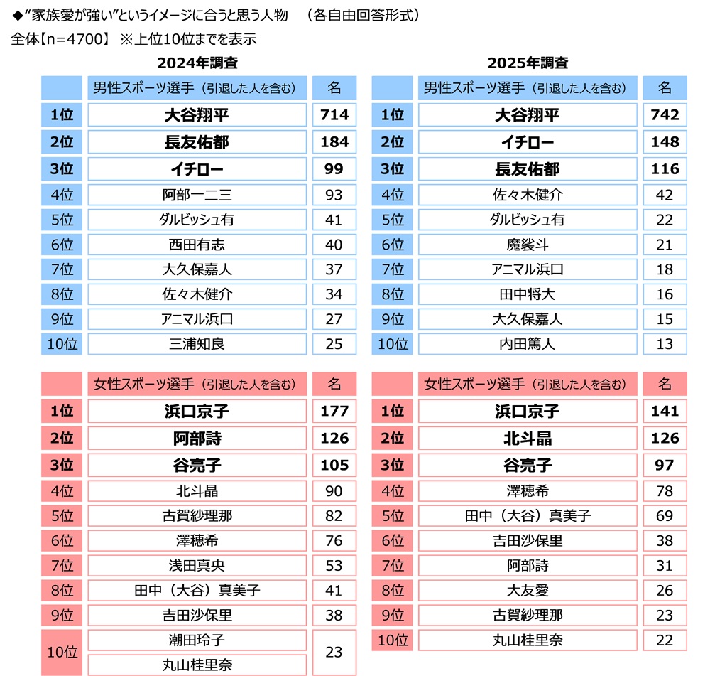 “家族愛が強い”というイメージに合うスポーツ選手を聞くと、男性スポーツ選手では「大谷翔平さん」がダントツとなり、2位「イチローさん」3位「長友佑都さん」と続きました。女性スポーツ選手では1位「浜口京子さん」2位「北斗晶さん」3位「谷亮子さん」となりました。