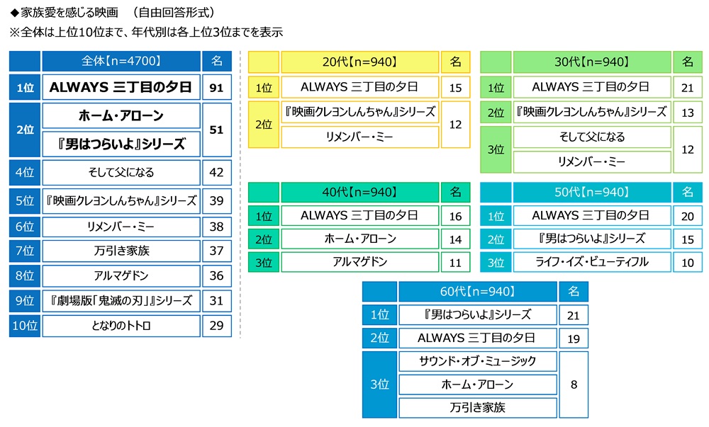 年代別にみると、60代では「『男はつらいよ』シリーズ」(21名)が1位となりました。また、30代以下ではピクサー映画の「リメンバー・ミー」(20代12名、30代12名)がTOP3にランクインしました。50代では第二次世界大戦中のユダヤ系家族を描いた作品「ライフ・イズ・ビューティフル」(10名)が3位に挙がりました。