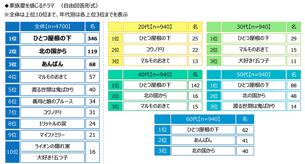 家族愛を感じるドラマ 「ひとつ屋根の下」がダントツ、「あんぱん」が3位に
