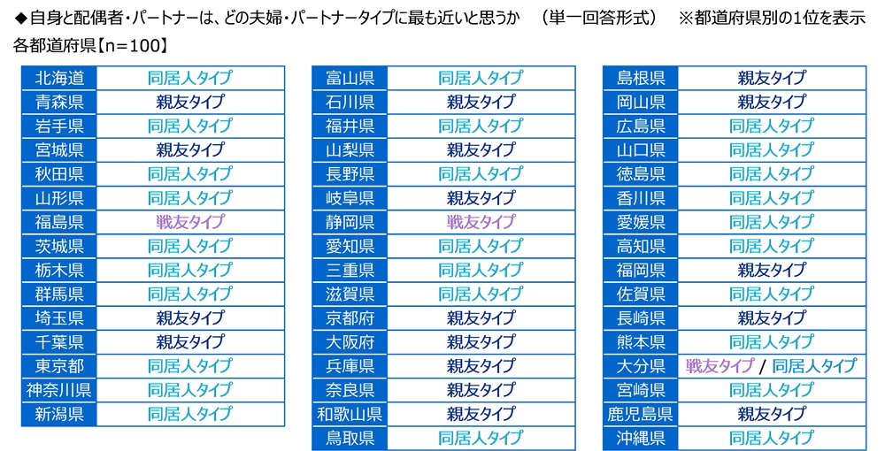 都道府県別にみると、多くの都道府県で1位は「同居人タイプ」、「親友タイプ」のいずれかとなり、福島県、静岡県、大分県では「戦友タイプ」が1位(大分県は「同居人タイプ」と同率)となりました。