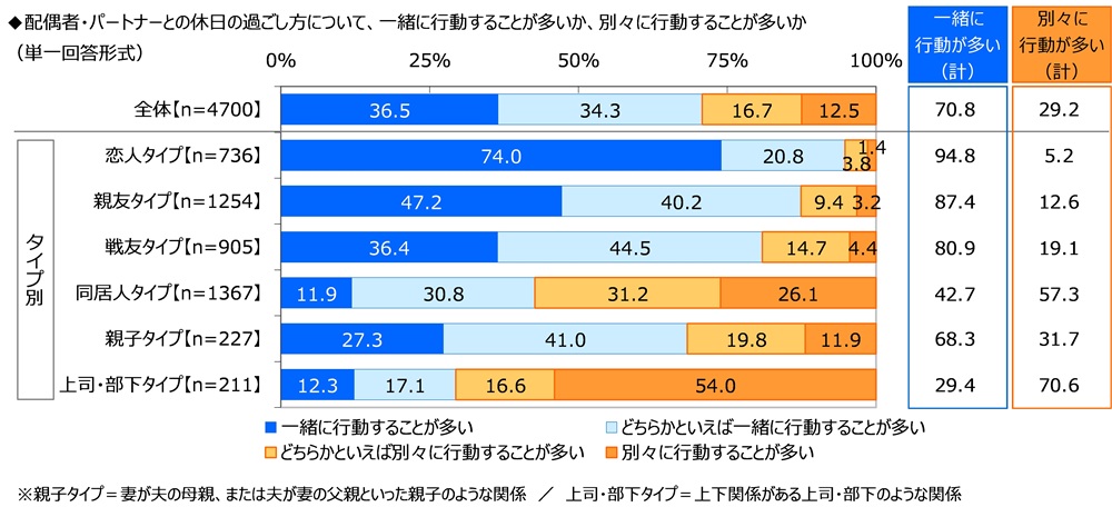 配偶者・パートナーとの休日の過ごし方 「一緒に行動することが多い」が71%