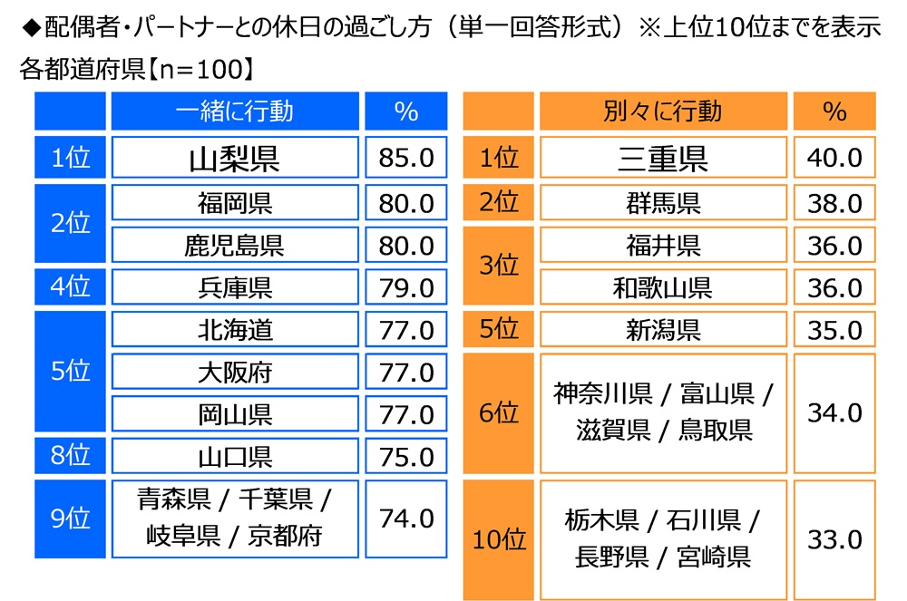 都道府県別にみると、“一緒に行動”が最も高くなったのは山梨県(85.0%)で、福岡県と鹿児島県(いずれも80.0%)が続きました。“別々に行動”が最も高くなったのは三重県(40.0%)で、群馬県(38.0%)、福井県と和歌山県(いずれも36.0%)が続きました。