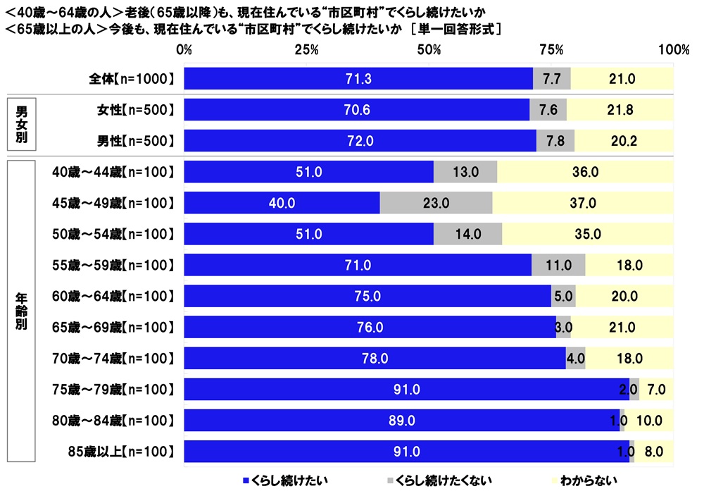 全回答者(1,000名)に、老後(65歳以降)・今後も、現在住んでいる“市区町村”でくらし続けたいか聞いたところ、「くらし続けたい」は71.3%、「くらし続けたくない」は7.7%、「わからない」は21.0%となりました。