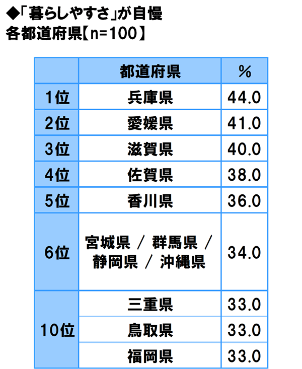 【暮らしやすさ自慢】のランキングをみると、1位「兵庫県」(44.0%)、2位「愛媛県」(41.0%)、3位「滋賀県」(40.0%)となりました。前回調査で2位だった兵庫県が1位に順位を上げました。理由をみると、1位の「兵庫県」では「店・病院・電車が近くにある」(20代女性)や「子育て支援が他の市町村よりわかりやすい」(40代男性)、2位の「愛媛県」では「小さい町の中に欲しいお店やスポットが集まっている」(20代男性)、3位の「滋賀県」では「物価が安い」(40代女性)といった回答がありました。