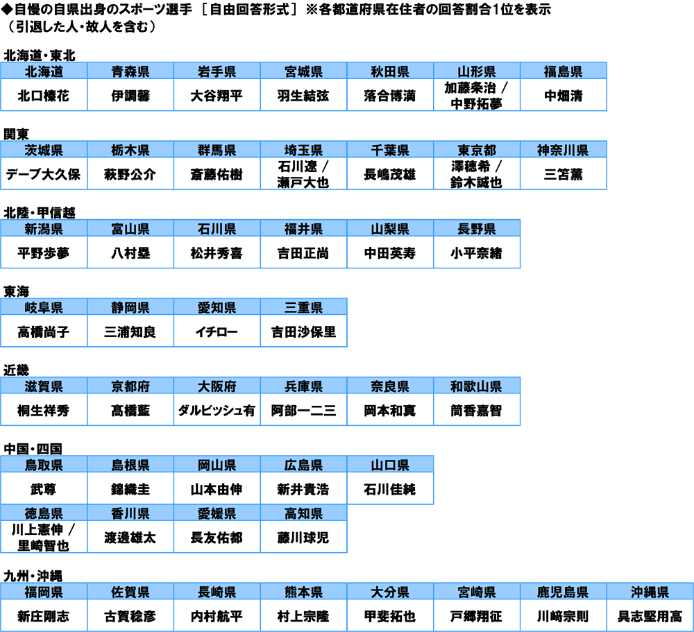 各都道府県の在住者(各都道府県100名)に、自慢の自県出身のスポーツ選手(引退した人・故人を含む)を聞いたところ、青森県では「伊調馨さん」、秋田県では「落合博満さん」、山形県では「加藤条治さん/中野拓夢さん」、栃木県では「萩野公介さん」、千葉県では「長嶋茂雄さん」、東京都では「澤穂希さん/鈴木誠也さん」、富山県では「八村塁さん」、長野県では「小平奈緒さん」、岐阜県では「高橋尚子さん」、静岡県では「三浦知良さん」、愛知県では「イチローさん」、三重県では「吉田沙保里さん」、滋賀県では「桐生祥秀さん」、和歌山県では「筒香嘉智さん」、鳥取県では「武尊さん」、岡山県では「山本由伸さん」、徳島県では「川上憲伸さん/里崎智也さん」、愛媛県では「長友佑都さん」、高知県では「藤川球児さん」、佐賀県では「古賀稔彦さん」、長崎県では「内村航平さん」、熊本県では「村上宗隆さん」、鹿児島県では「川﨑宗則さん」といった選手が挙げられました。