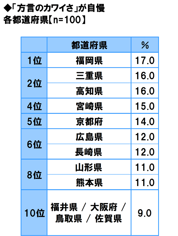 【方言のカワイさ自慢】では1位「福岡県」(17.0%)、2位「三重県」「高知県」(同率16.0%)と、福岡県が7年連続の1位となりました。