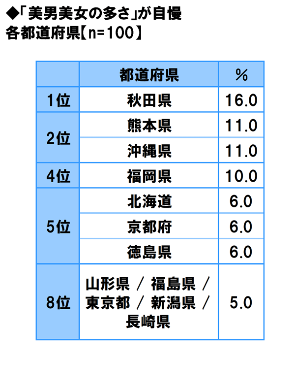 【美男美女の多さ自慢】では1位「秋田県」(16.0%)、2位「熊本県」「沖縄県」(同率11.0%)と、秋田県が昨年3位から順位を上げ、2016年調査以来9年ぶりの1位となりました。
