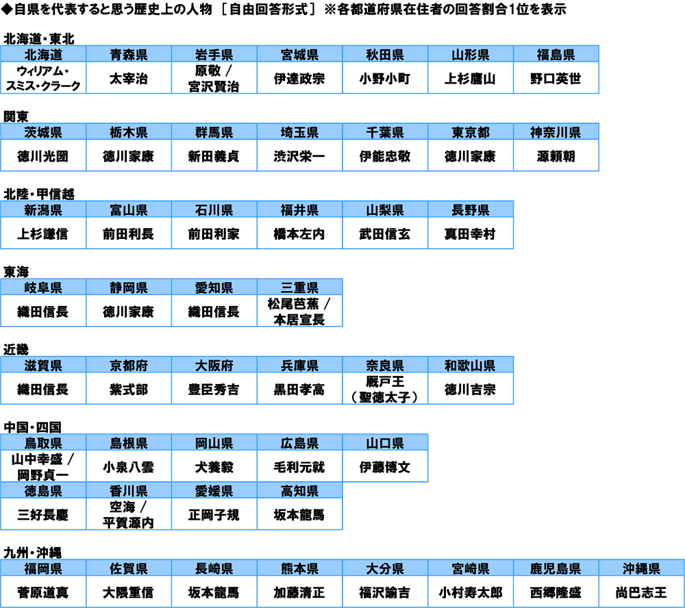 各都道府県の在住者(各都道府県100名)に、自県を代表すると思う歴史上の人物を聞いたところ、青森県では「太宰治」、岩手県では「原敬/宮沢賢治」、宮城県では「伊達政宗」、福島県では「野口英世」、群馬県では「新田義貞」、神奈川県では「源頼朝」、新潟県では「上杉謙信」、富山県では「前田利長」、石川県では「前田利家」、福井県では「橋本左内」、長野県では「真田幸村」、三重県では「松尾芭蕉/本居宣長」、京都府では「紫式部」、兵庫県では「黒田孝高」、和歌山県では「徳川吉宗」、島根県では「小泉八雲」、岡山県では「犬養毅」、山口県では「伊藤博文」、香川県では「空海/平賀源内」、福岡県では「菅原道真」、佐賀県では「大隈重信」、宮崎県では「小村寿太郎」といった人物が挙げられました。