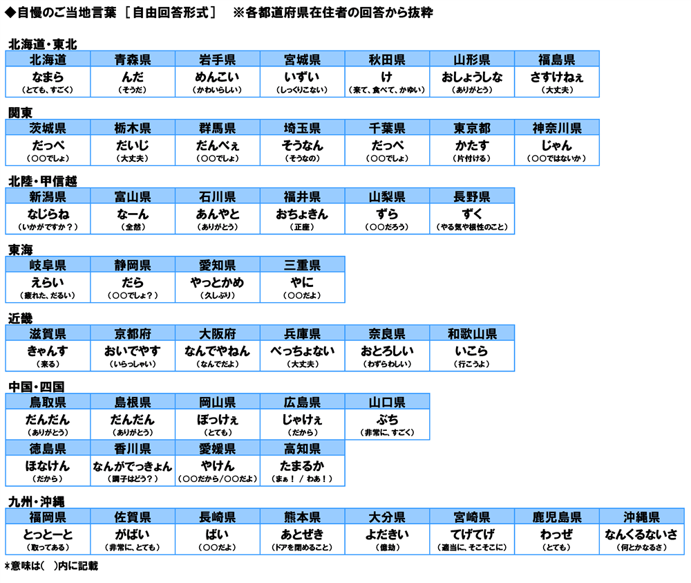 各都道府県の在住者(各都道府県100名)に、自県の自慢のご当地言葉を聞いたところ、青森県では「んだ」、宮城県では「いずい」、福島県では「さすけねぇ」、栃木県では「だいじ」、埼玉県では「そうなん」、東京都では「かたす」、富山県では「なーん」、福井県では「おちょきん」、長野県では「ずく」、静岡県では「だら」、三重県では「やに」、滋賀県では「きゃんす」、奈良県では「おとろしい」、和歌山県では「いこら」、岡山県では「ぼっけぇ」、広島県では「じゃけぇ」、愛媛県では「やけん」、高知県では「たまるか」、佐賀県では「がばい」、熊本県では「あとぜき」、宮崎県では「てげてげ」、沖縄県では「なんくるないさ」といった言葉が挙げられました。