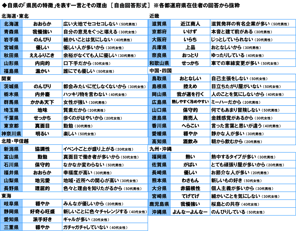 また、秋田県では「ええふりこき」(見栄っ張り)、大阪府では「いらち」(気が短い)、香川県では「へらこい」(ずる賢い)、熊本県では「わさもん」(新しいもの好き)、沖縄県「よんなーよんなー」(ゆっくり)といったご当地言葉が県民性を表す一言として挙げられました。