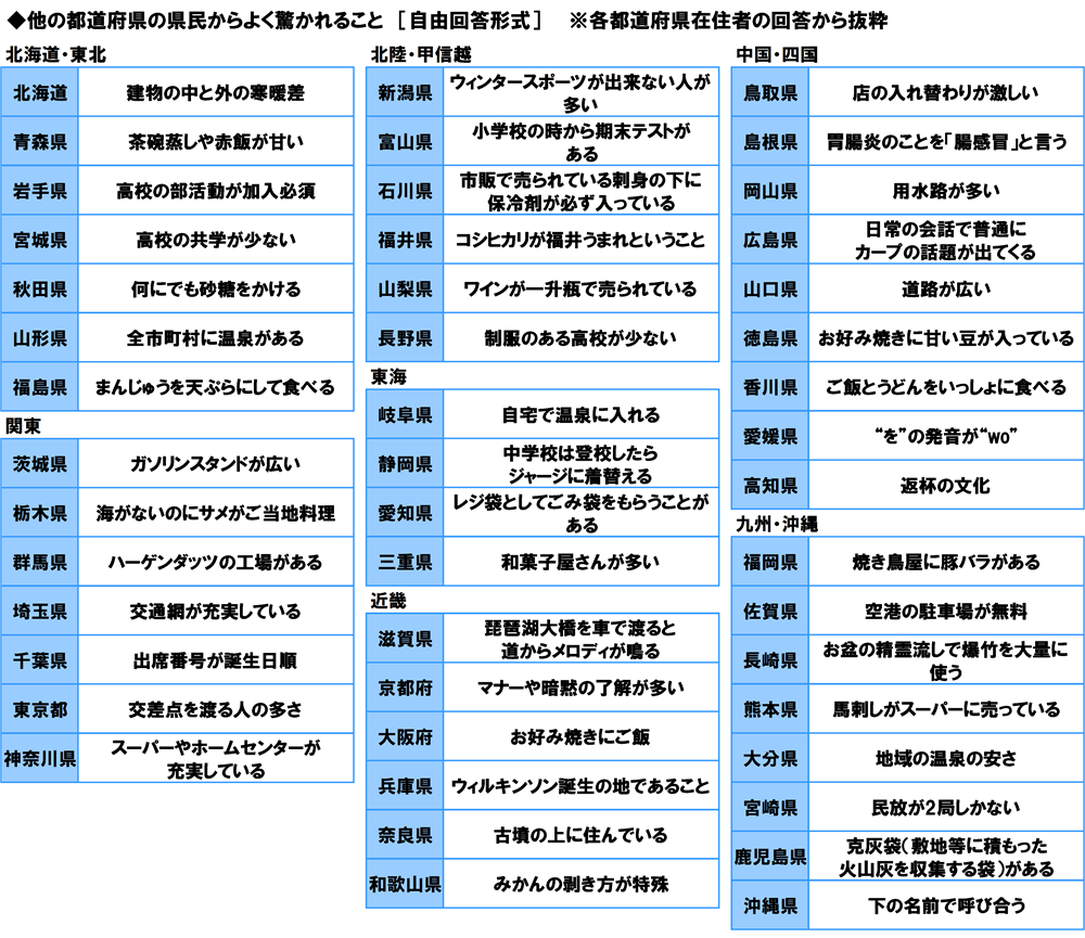 飲食に関する回答をみると、青森県では「茶碗蒸しや赤飯が甘い」、福島県では「まんじゅうを天ぷらにして食べる」、栃木県では「海がないのにサメがご当地料理」、山梨県では「ワインが一升瓶で売られている」、和歌山県では「みかんの剥き方が特殊」、徳島県では「お好み焼きに甘い豆が入っている」、高知県では「返杯の文化」、習慣や環境に関する回答をみると、岩手県では「高校の部活動が加入必須」、山形県では「全市町村に温泉がある」、埼玉県では「交通網が充実している」、新潟県では「ウィンタースポーツが出来ない人が多い」、岐阜県では「自宅で温泉に入れる」、愛知県では「レジ袋としてごみ袋をもらうことがある」、奈良県では「古墳の上に住んでいる」、鳥取県では「店の入れ替わりが激しい」、岡山県では「用水路が多い」、長崎県では「お盆の精霊流しで爆竹を大量に使う」、沖縄県では「下の名前で呼び合う」といった回答がみられ、各都道府県ならではの食文化や環境があることがわかりました。