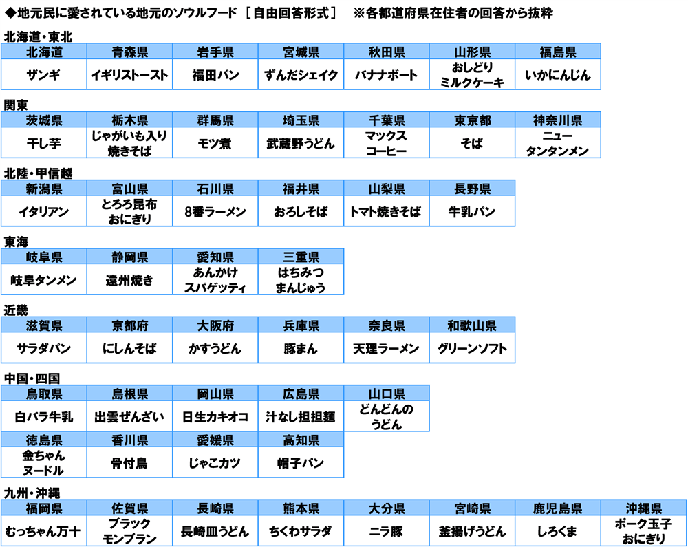 各都道府県の在住者(各都道府県100名)に、地元民に愛されている地元のソウルフードを聞いたところ、北海道では「ザンギ」、青森県では「イギリストースト」、岩手県では「福田パン」、山形県では「おしどりミルクケーキ」、福島県では「いかにんじん」、栃木県では「じゃがいも入り焼きそば」、群馬県では「モツ煮」、埼玉県では「武蔵野うどん」、千葉県では「マックスコーヒー」、新潟県では「イタリアン」、富山県では「とろろ昆布おにぎり」、山梨県では「トマト焼きそば」、静岡県では「遠州焼き」、三重県では「はちみつまんじゅう」、滋賀県では「サラダパン」、兵庫県では「豚まん」、和歌山県では「グリーンソフト」、鳥取県では「白バラ牛乳」、岡山県では「日生カキオコ」、広島県では「汁なし担担麺」、徳島県では「金ちゃんヌードル」、愛媛県では「じゃこカツ」、高知県では「帽子パン」、佐賀県では「ブラックモンブラン」、熊本県では「ちくわサラダ」、大分県では「ニラ豚」、鹿児島県では「しろくま」、沖縄県では「ポーク玉子おにぎり」といった回答がみられました。