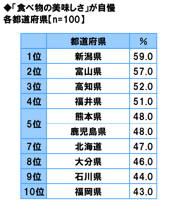 【食べ物の美味しさ自慢】では1位「新潟県」(59.0%)、2位「富山県」(57.0%)、3位「高知県」(52.0%)、【お酒の美味しさ自慢】では1位「新潟県」(48.0%)、2位「鹿児島県」(36.0%)、3位「高知県」(33.0%)と、どちらも新潟県が1位でした。新潟県は、日本一の米どころとしてだけではなく、山の幸、海の幸にも恵まれており、酒蔵の数と清酒消費量も日本一であることが理由ではないかと思われます。また、【食べ物の美味しさ自慢】【お酒の美味しさ自慢】ともにTOP3は前回調査と同様となりました。