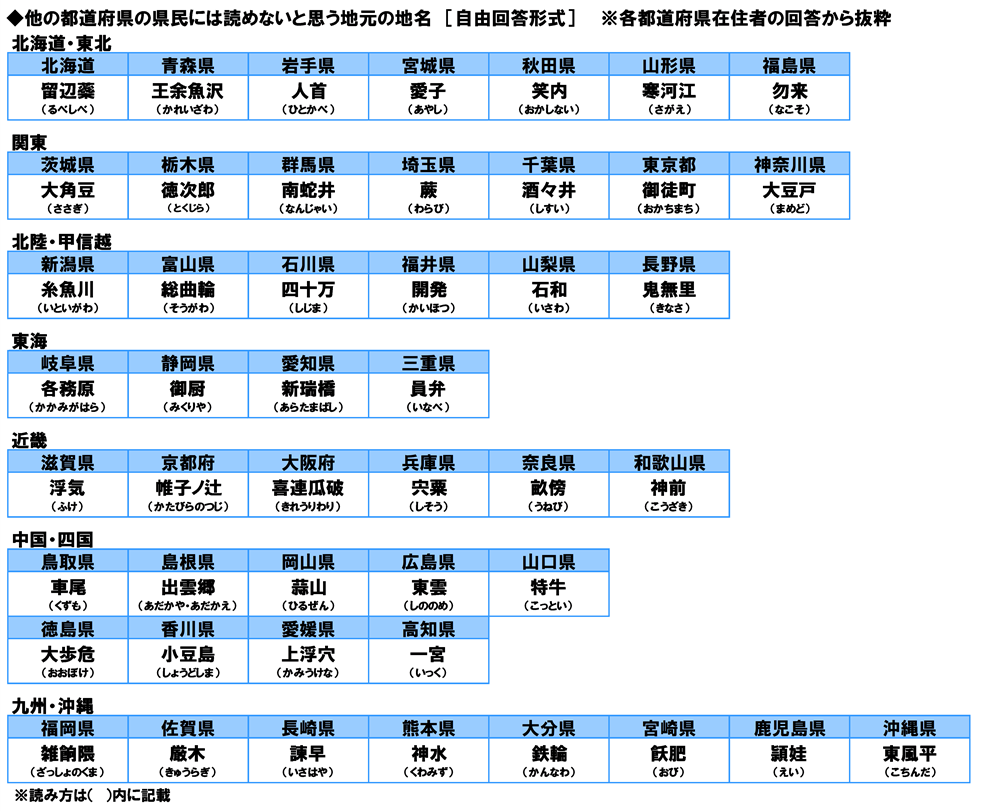 各都道府県の在住者(各都道府県100名)に、他の都道府県の県民には読めないと思う地元の地名を聞いたところ、北海道では「留辺蘂」、青森県では「王余魚沢」、岩手県では「人首」、秋田県では「笑内」、山形県では「寒河江」、栃木県では「徳次郎」、群馬県では「南蛇井」、東京都では「御徒町」、神奈川県では「大豆戸」、富山県では「総曲輪」、石川県では「四十万」、福井県では「開発」、愛知県では「新瑞橋」、三重県では「員弁」、滋賀県では「浮気」、京都府では「帷子ノ辻」、大阪府では「喜連瓜破」、鳥取県では「車尾」、島根県では「出雲郷」、岡山県では「蒜山」、徳島県では「大歩危」、香川県では「小豆島」、愛媛県では「上浮穴」、大分県では「鉄輪」、宮崎県では「飫肥」、鹿児島県では「頴娃」、沖縄県では「東風平」といった回答がみられました。