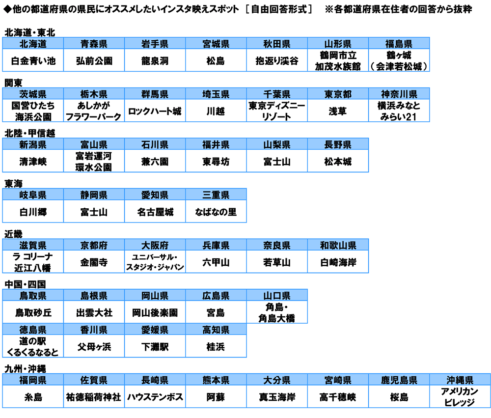 各都道府県の在住者(各都道府県100名)に、他の都道府県の県民におすすめしたいインスタ映えスポットを聞いたところ、北海道では「白金青い池」、岩手県では「龍泉洞」、宮城県では「松島」、秋田県では「抱返り渓谷」、福島県では「鶴ヶ城(会津若松城)」、茨城県では「国営ひたち海浜公園」、栃木県では「あしかがフラワーパーク」、群馬県では「ロックハート城」、千葉県では「東京ディズニーリゾート」、東京都では「浅草」、新潟県では「清津峡」、石川県では「兼六園」、福井県では「東尋坊」、山梨県と静岡県では「富士山」、愛知県では「名古屋城」、三重県では「なばなの里」、大阪府では「ユニバーサル・スタジオ・ジャパン」、兵庫県では「六甲山」、鳥取県では「鳥取砂丘」、島根県では「出雲大社」、岡山県では「岡山後楽園」、徳島県では「道の駅くるくるなると」、香川県では「父母ヶ浜」、佐賀県では「祐徳稲荷神社」、長崎県では「ハウステンボス」、熊本県では「阿蘇」、大分県では「真玉海岸」、宮崎県では「高千穂峡」、鹿児島県では「桜島」、沖縄県では「アメリカンビレッジ」といった回答がみられました。