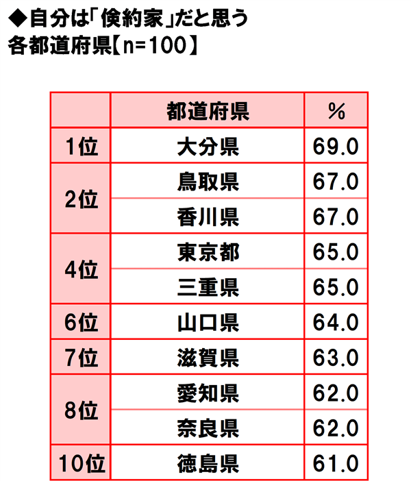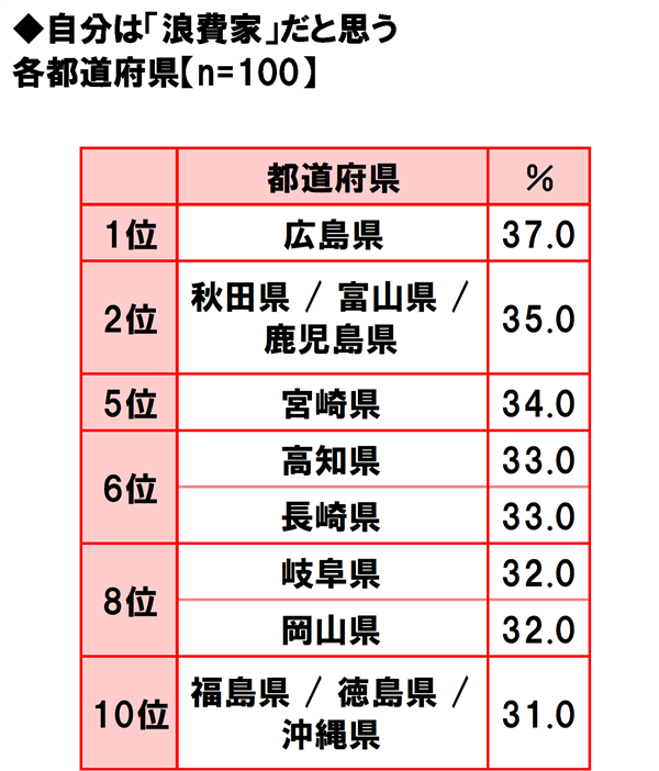 【自分は倹約家だと思う】では1位「大分県」(69.0%)、2位「鳥取県」「香川県」(同率67.0%)、【自分は浪費家だと思う】では1位「広島県」(37.0%)、2位「秋田県」「富山県」「鹿児島県」(同率35.0%)となりました。