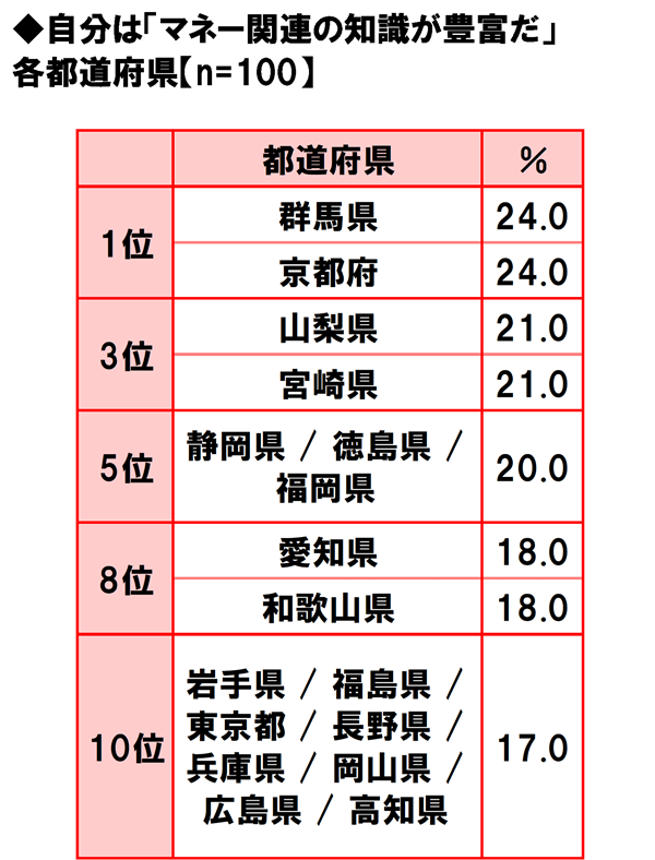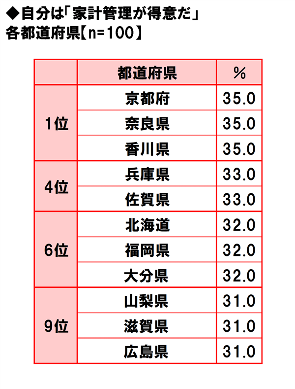 【自分はマネー関連の知識が豊富だ】では1位「群馬県」「京都府」(同率24.0%)、3位「山梨県」「宮崎県」(同率21.0%)、【自分は家計管理が得意だ】では1位「京都府」「奈良県」「香川県」(同率35.0%)となりました。