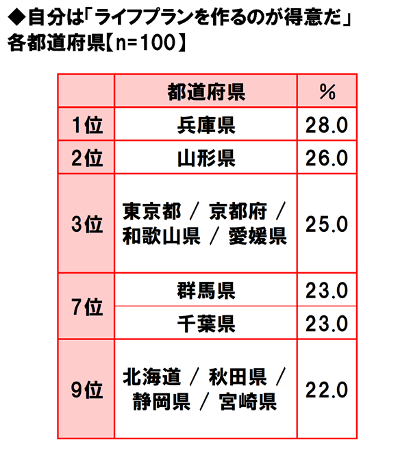 【自分はライフプランを作るのが得意だ】では、1位「兵庫県」(28.0%)、2位「山形県」(26.0%)、3位「東京都」「京都府」「和歌山県」「愛媛県」(同率25.0%)となりました。