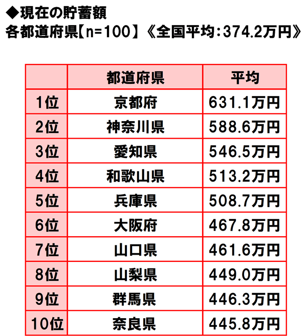 貯蓄額についてみると、現在の貯蓄額の平均は、1位「京都府」(631.1万円)、2位「神奈川県」(588.6万円)、3位「愛知県」(546.5万円)となりました。