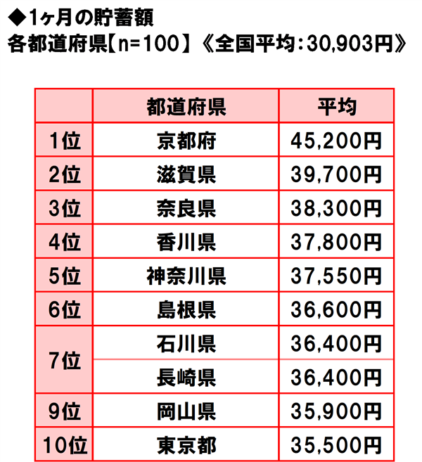 現在の平均貯蓄額 1位「京都府」631.1万円、1ヶ月の平均貯蓄額 1位「京都府」45,200円