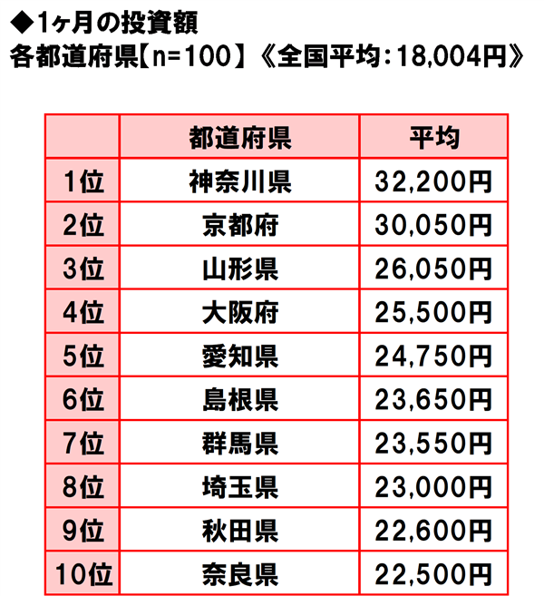 投資額についてみると、1ヶ月の投資額の平均は、1位「神奈川県」(32,200円)、2位「京都府」(30,050円)、3位「山形県」(26,050円)となりました。