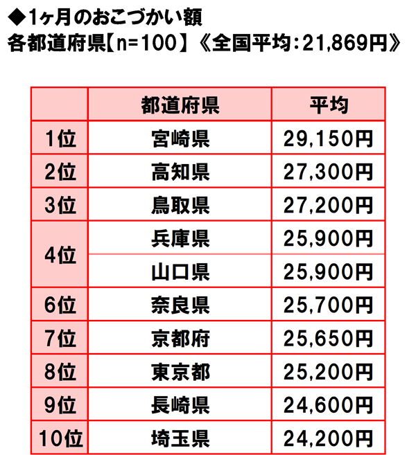 1ヶ月のおこづかいの平均額 1位「宮崎県」29,150円、2位「高知県」27,300円、3位「鳥取県」27,200円