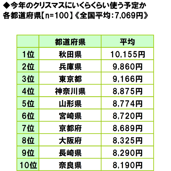 はじめに、今年のクリスマス(プレゼント代、食事代を含めた総額)にいくらくらい使う予定か聞いたところ、平均額は1位「秋田県」(10,155円)、2位「兵庫県」(9,860円)、3位「東京都」(9,166円)となりました。1位の秋田県では全国平均(7,069円)と比較して3,086円高くなりました。